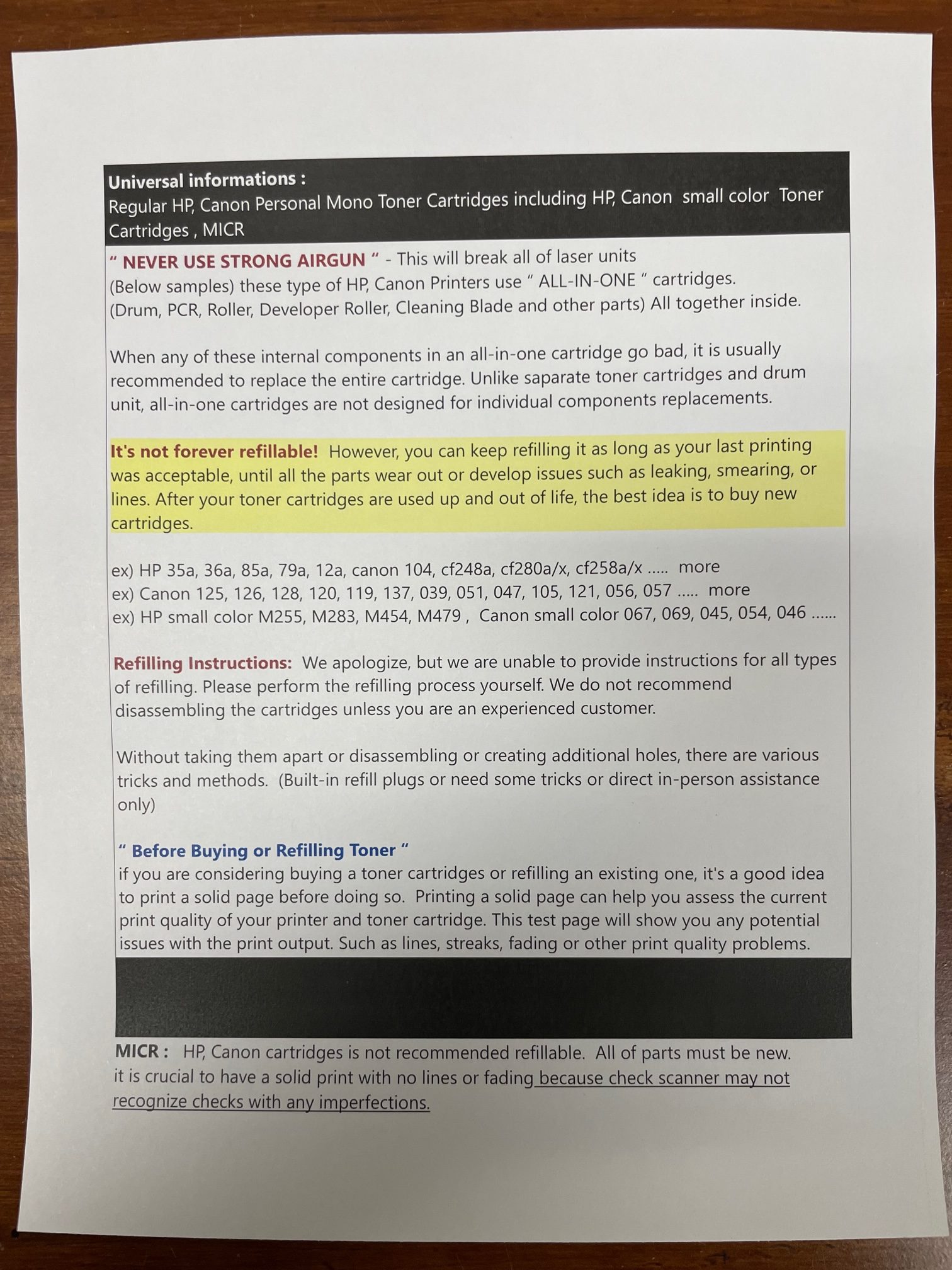 ” Filling chart for HP CF281X, Canon 039H : 1160g