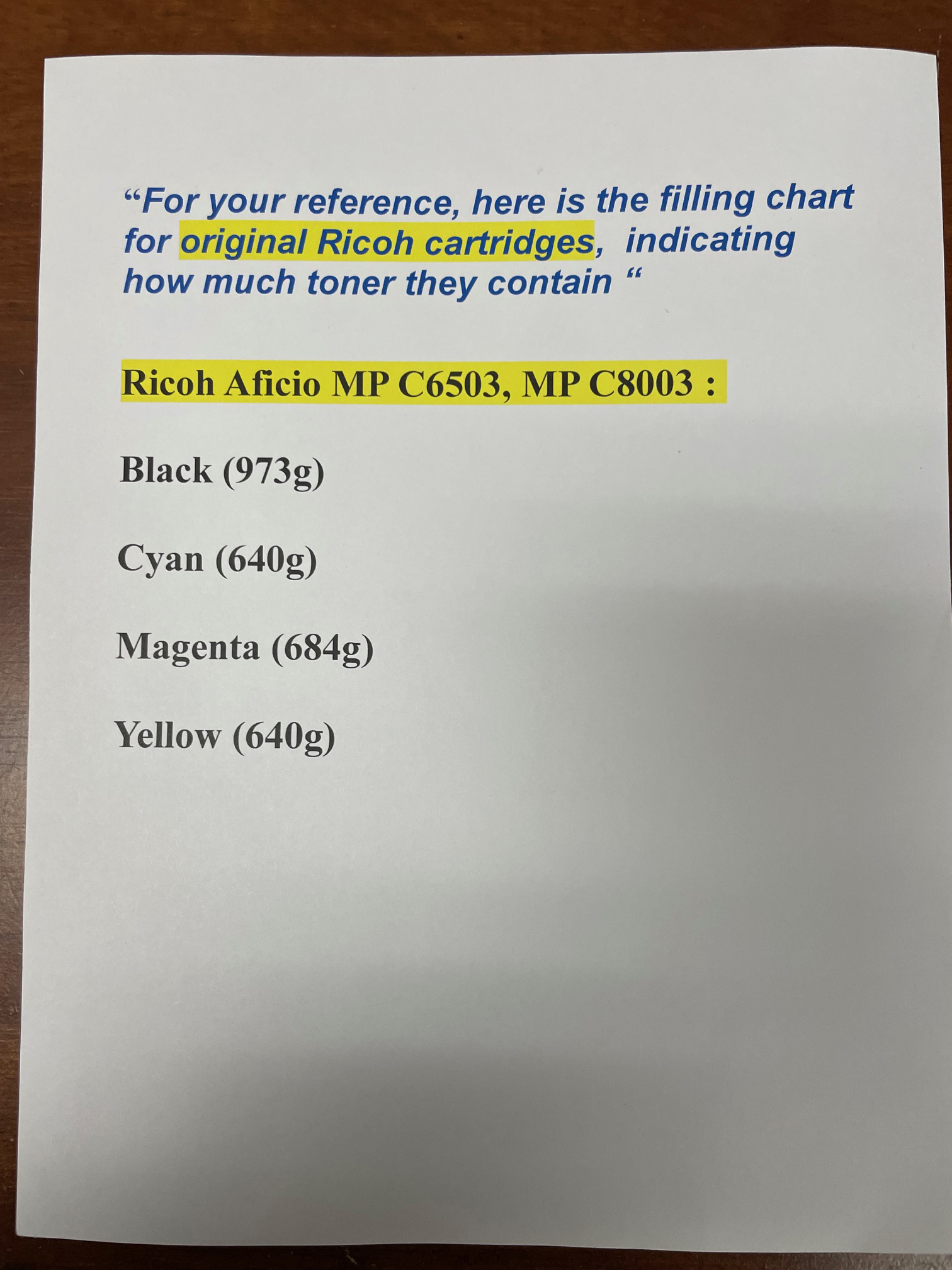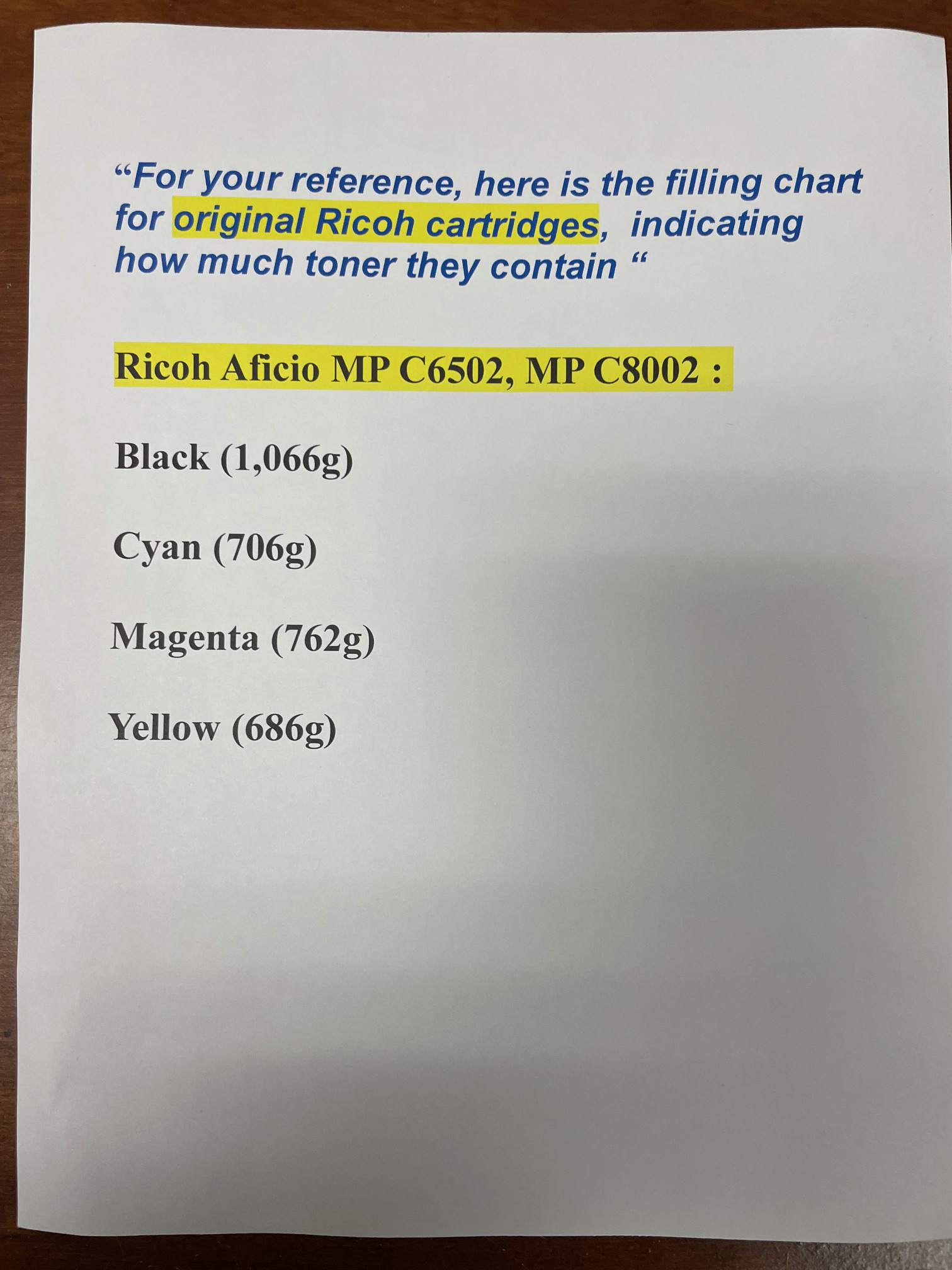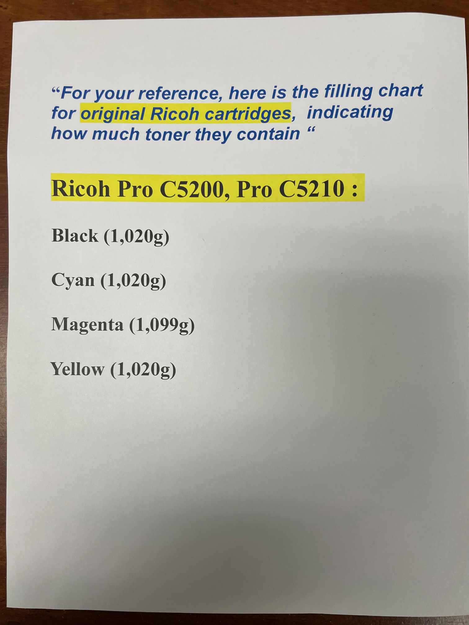 “For your reference, here is the filling chart for original Ricoh cartridges, indicating how much toner they contain “