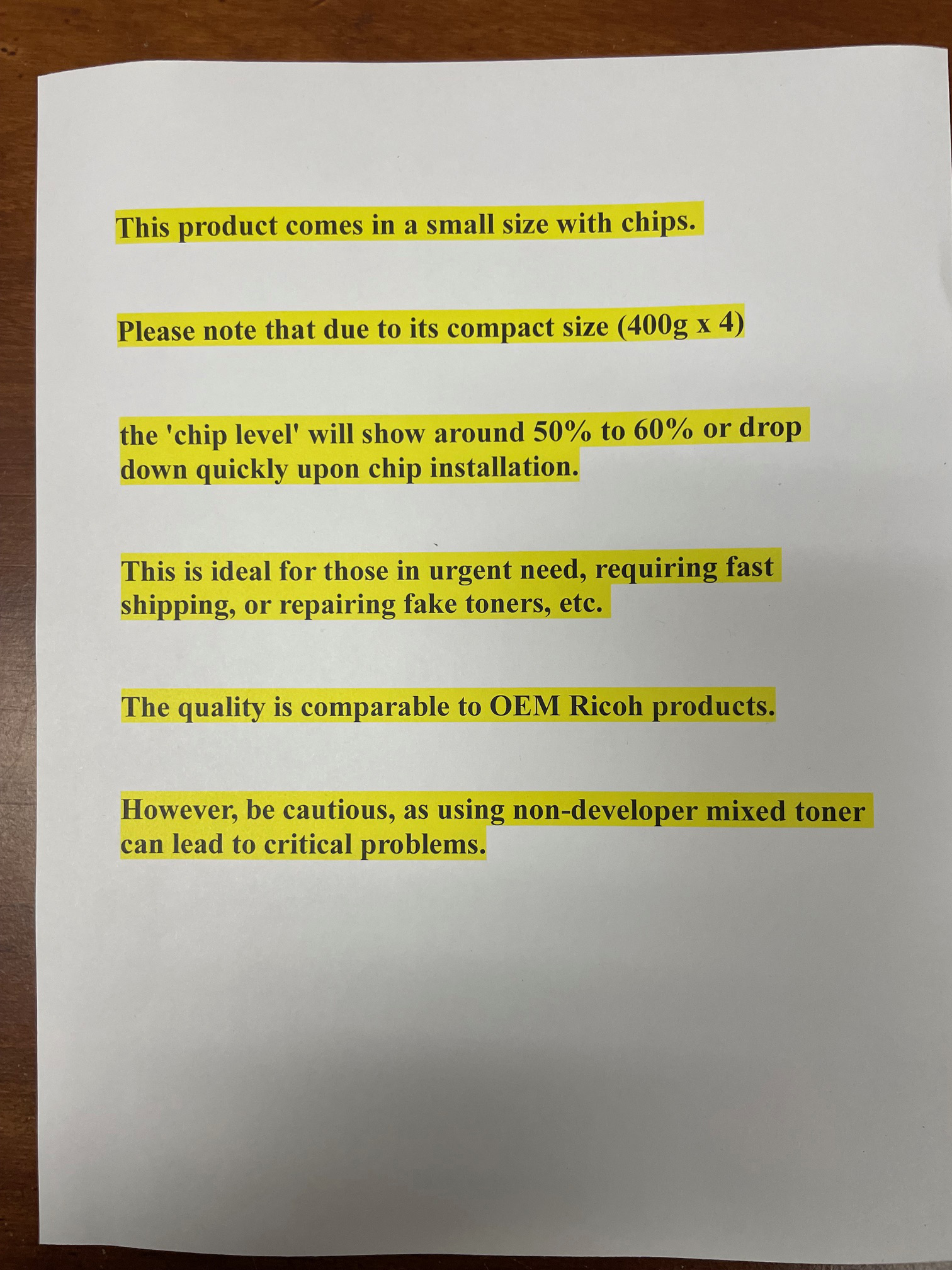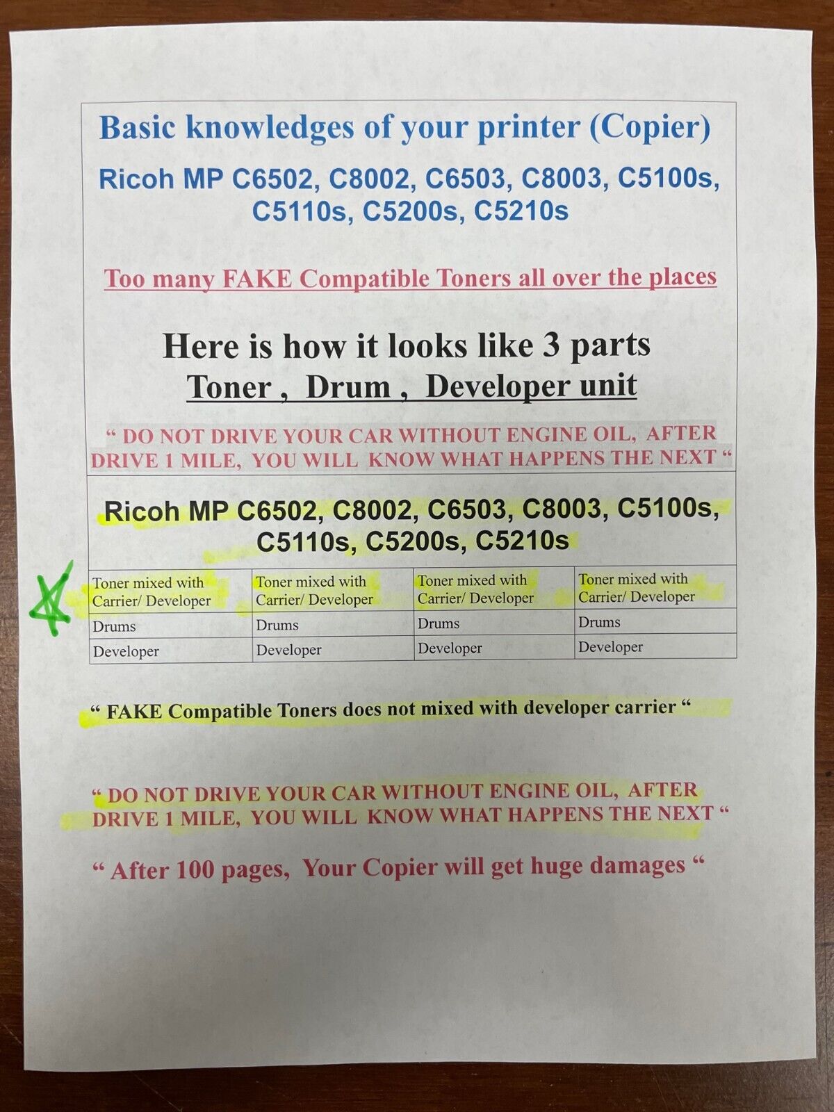 ” The original Ricoh toner contains a pre-mixed carrier. If you use an unknown toner without pre-mixed carrier in this printer, it may result in critical damage “