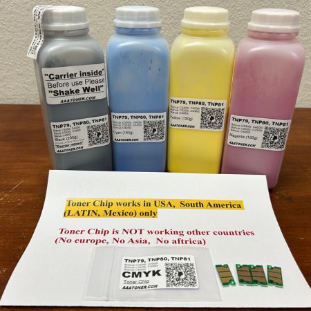 4 Toner Refill for Konica Minolta Bizhub C3300i, C4000i, C3320i, C3350i, C4050i + 4 Chips (TNP79, TNP80, TNP81)