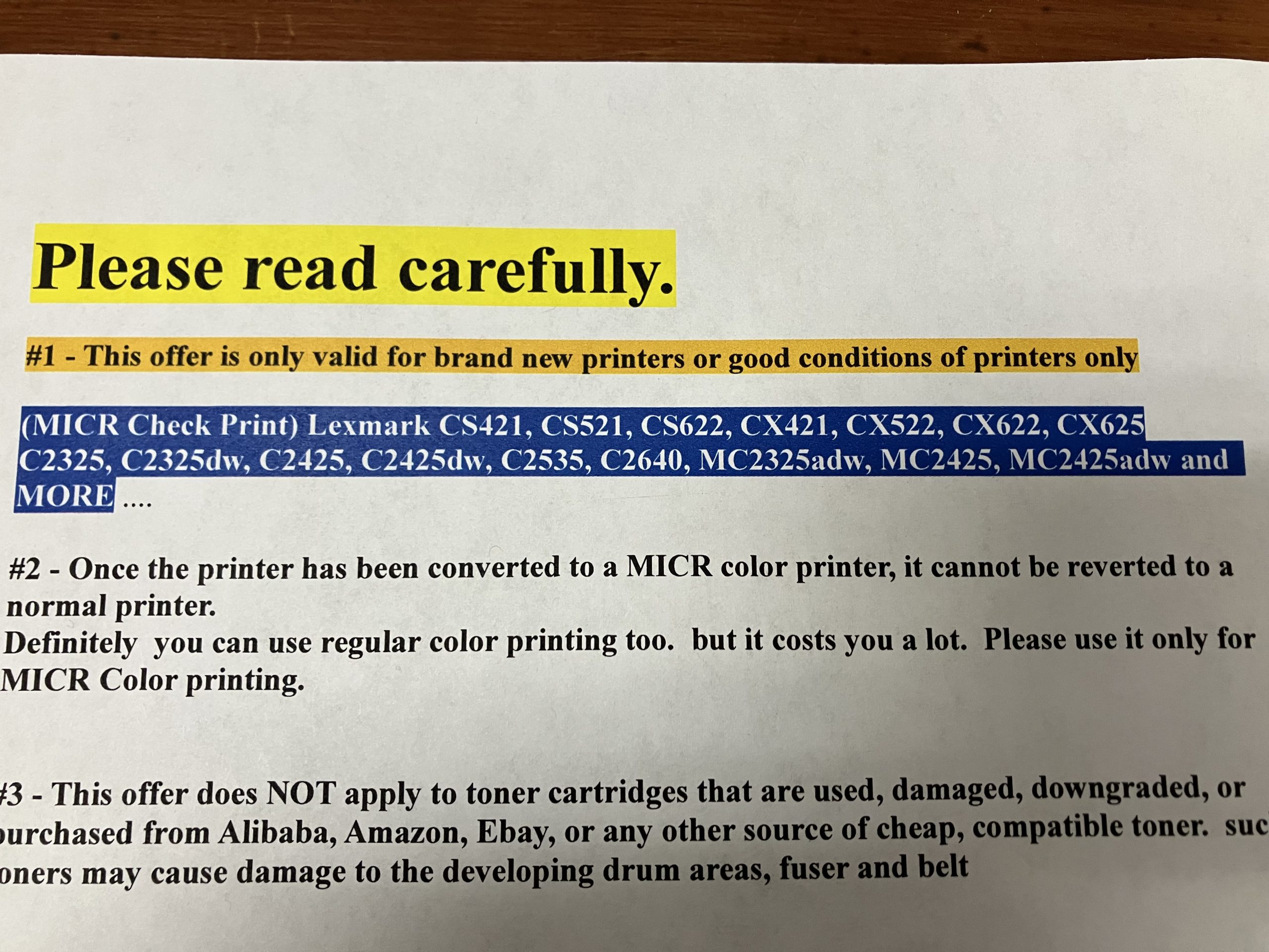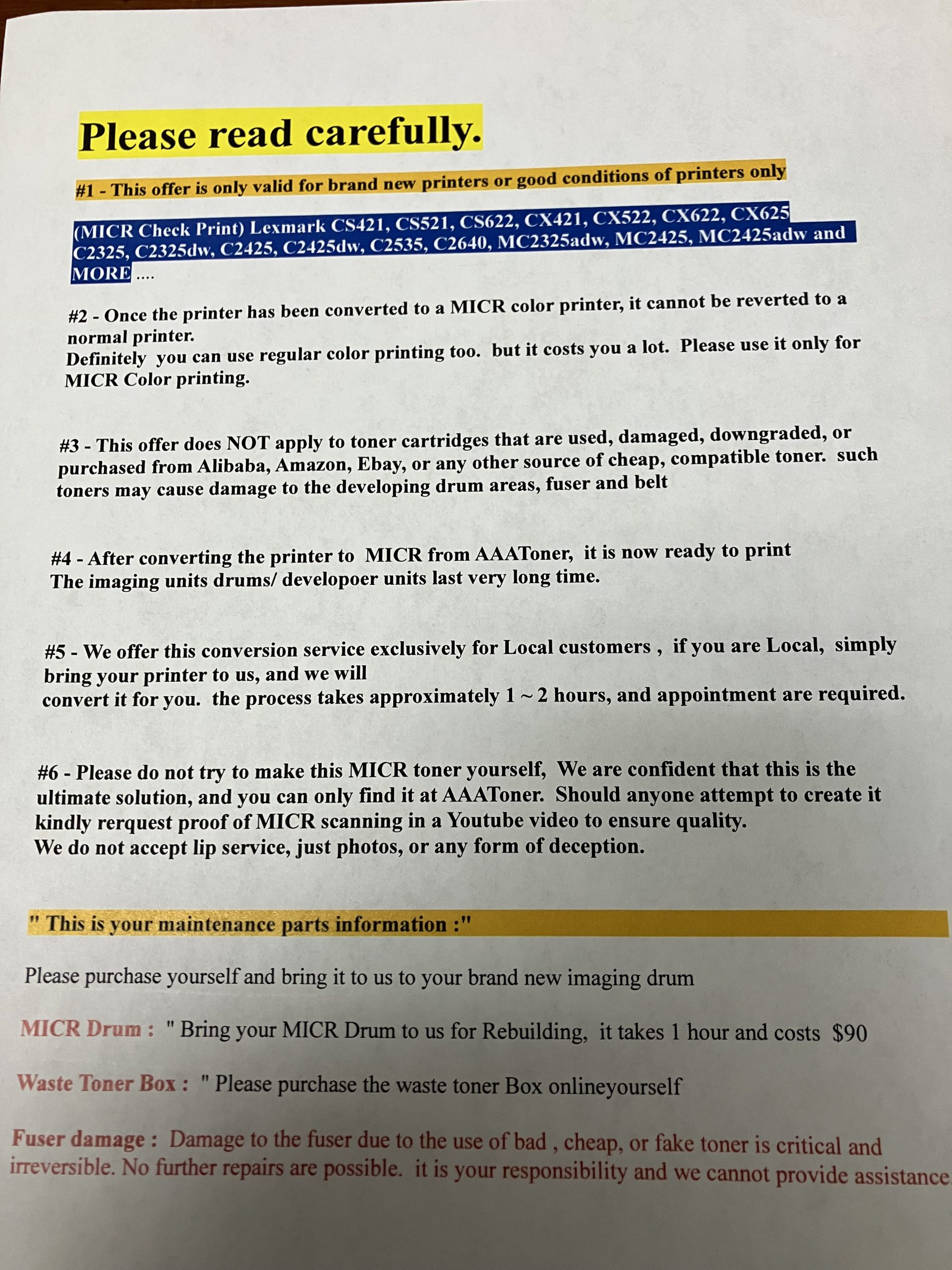 ” Please don’t buy this unless if you are not using our MICR Toner “