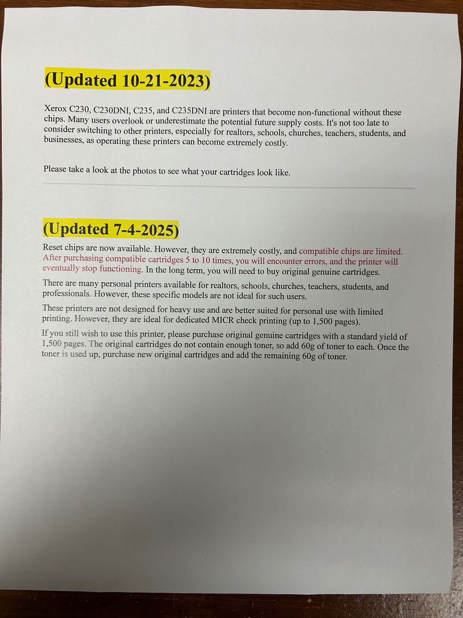 “ Xerox C230, C230DNI, C235, C235DNI (Maybe more… ) printers, rendering the printers non-functional without these chips. Many people tend to overlook and underestimate the potential future supply costs. It’s not too late to consider switching to different printers, especially for realtors, schools, Church and teachers, as operating these printers may become extremely costly.”